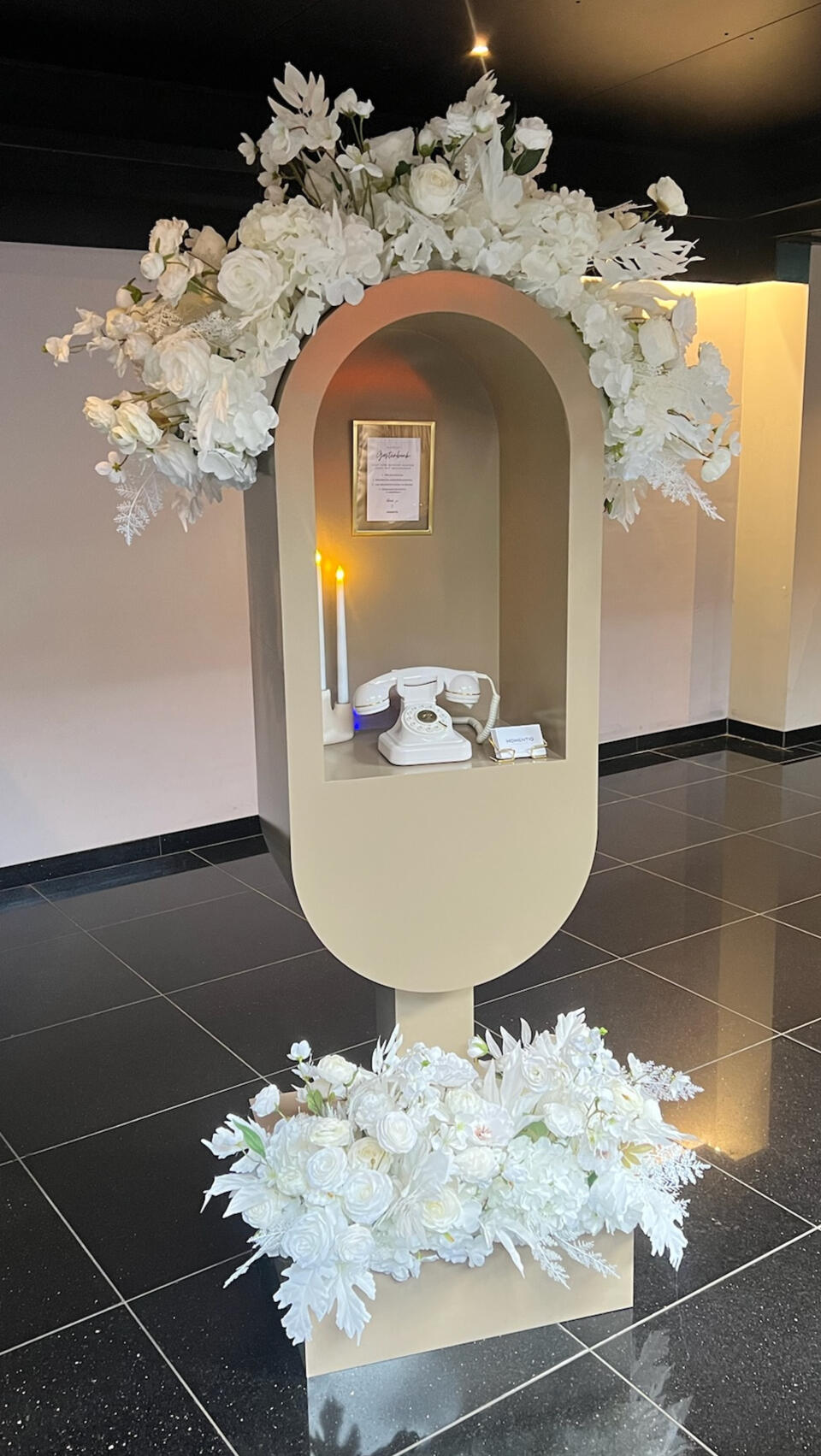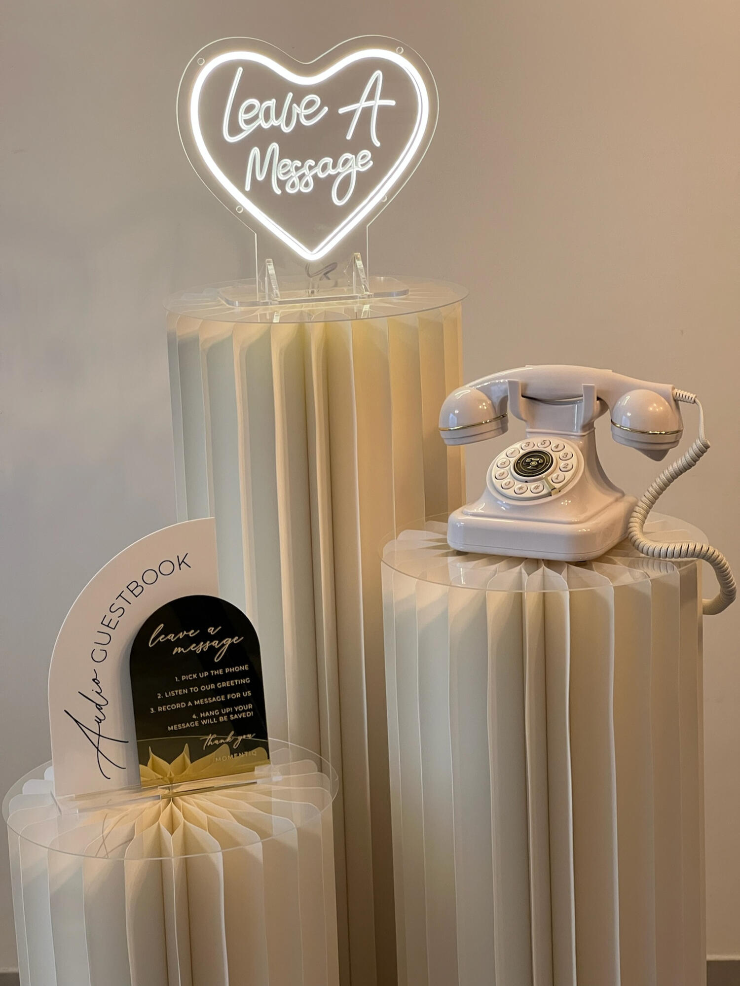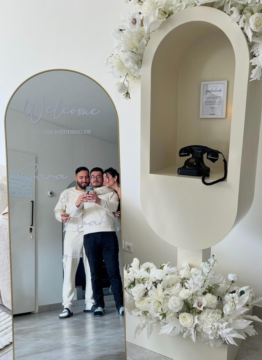 In plaats van een traditioneel boek kunnen jullie gasten hun persoonlijke boodschappen inspreken, hun wensen en herinneringen delen in hun eigen stem. Deze aanpak zorgt voor een waardevol aandenken vol oprechte woorden. Wij leveren prachtige booths in 3 verschillende kleuren die naar smaak kunnen worden aangekleed. Wil je geen booth? Dan kun je onze retro telefoons ook los huren, met eventueel zuilen en aankleding. Klik hier om een afspraak te maken!