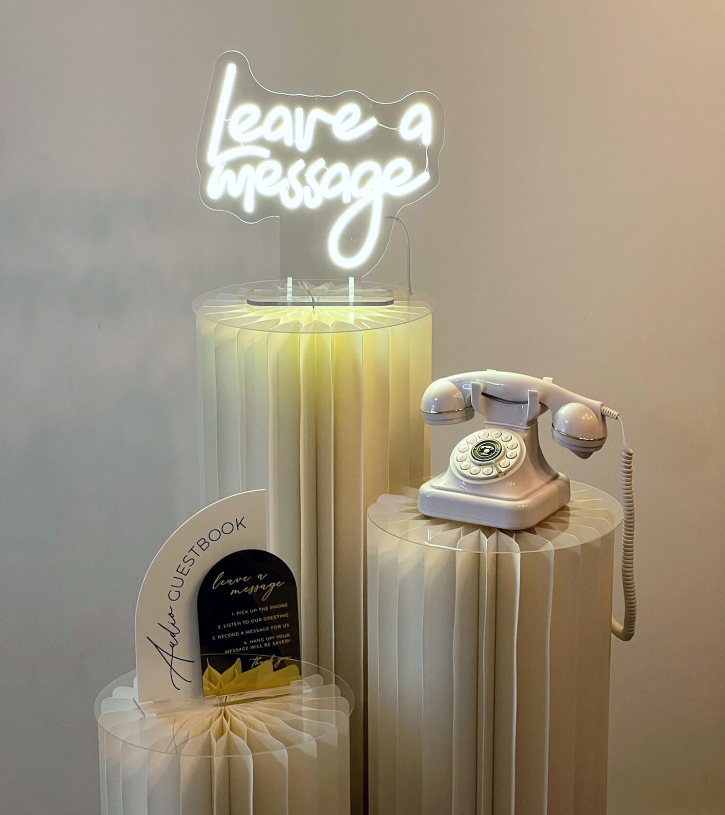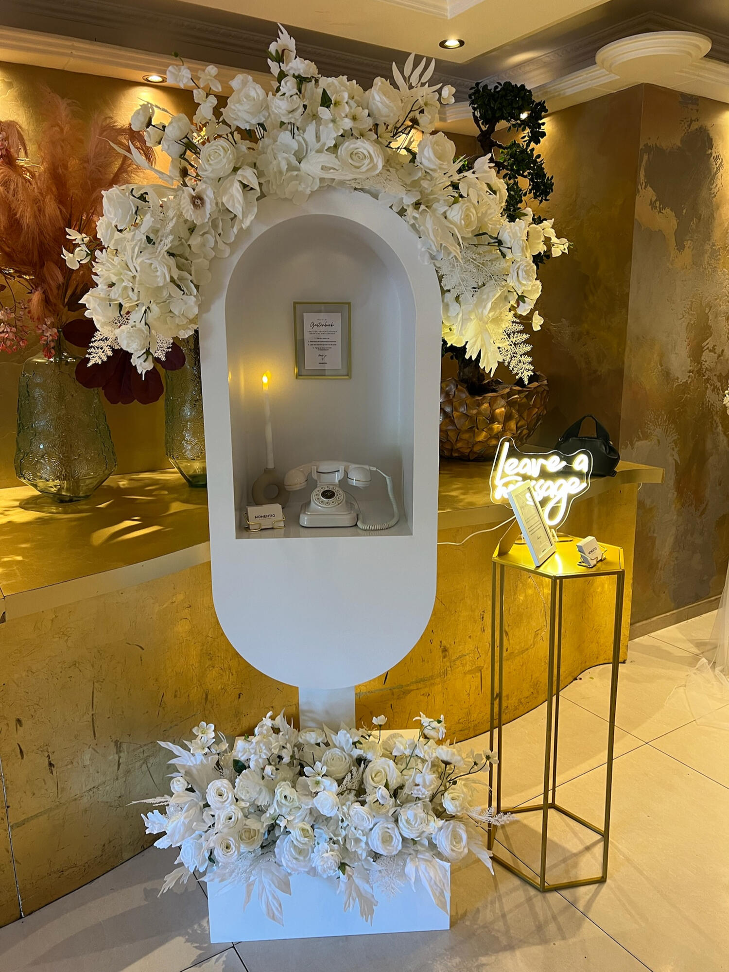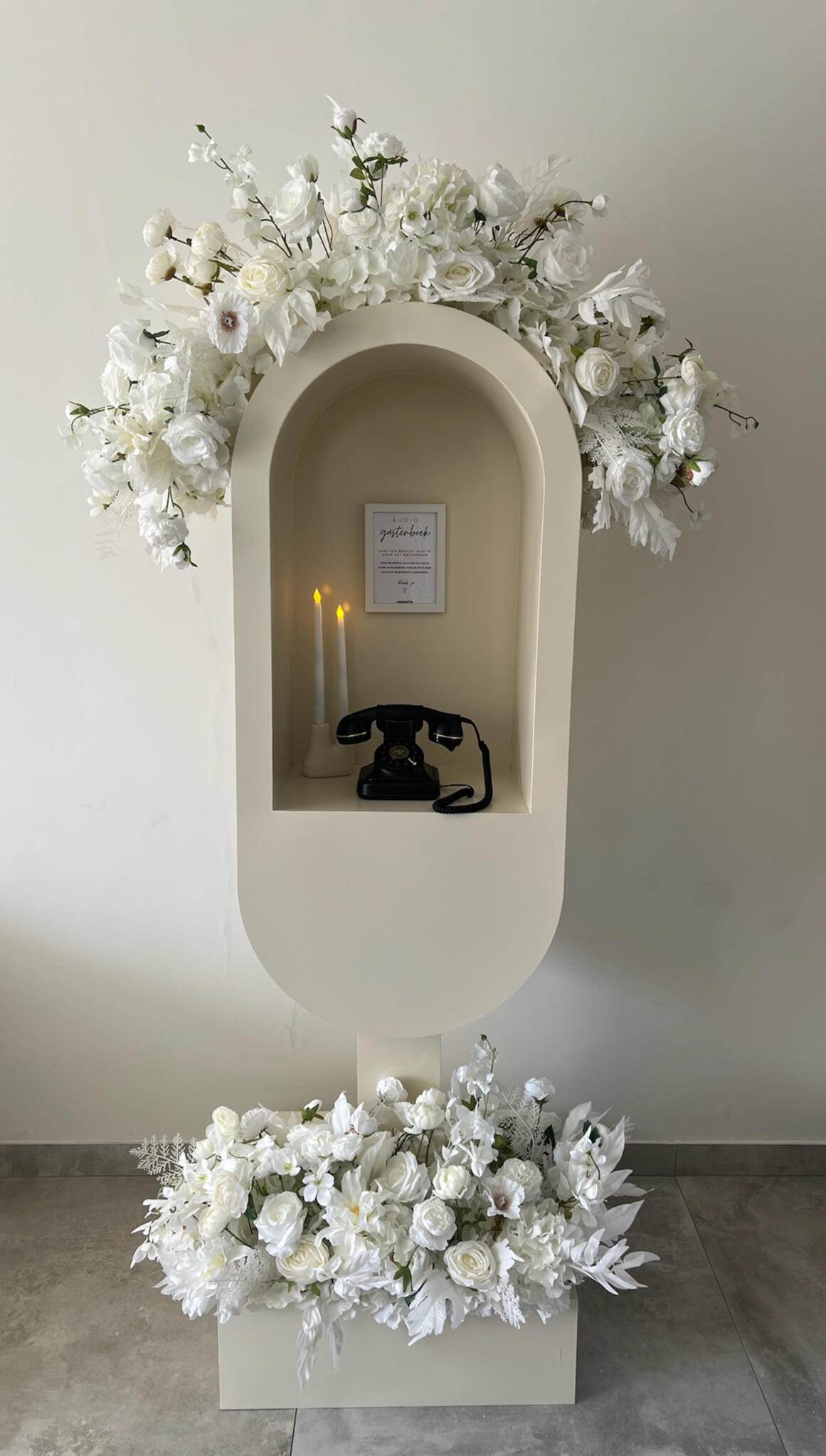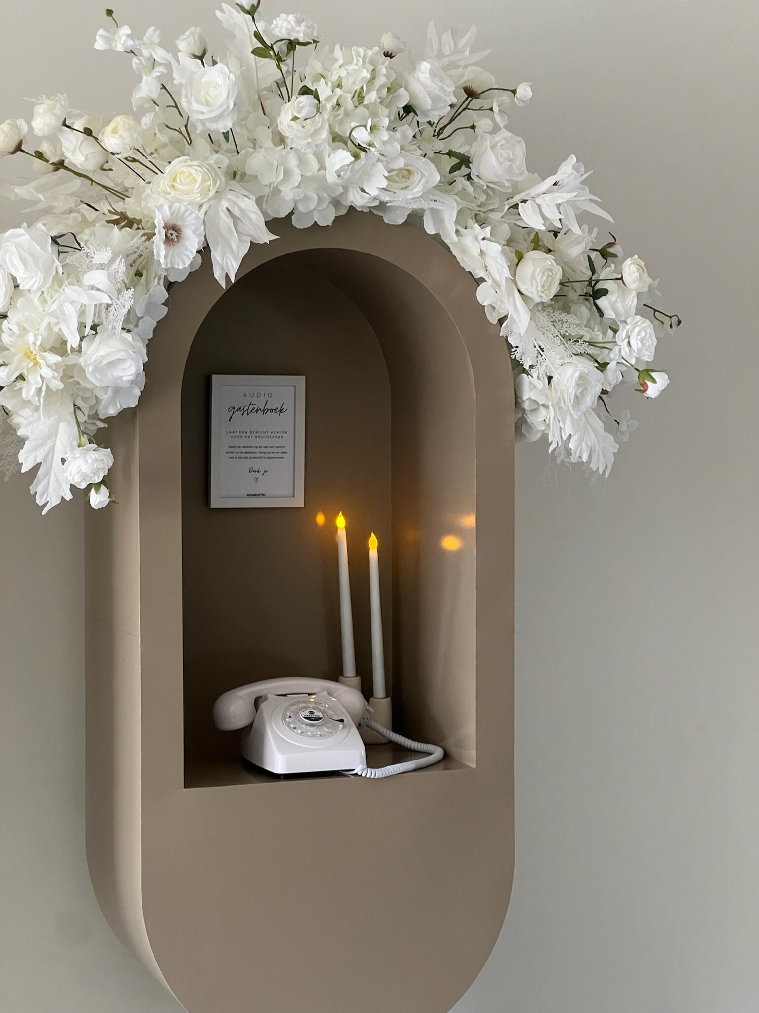 In plaats van een traditioneel boek kunnen jullie gasten hun persoonlijke boodschappen inspreken, hun wensen en herinneringen delen in hun eigen stem. Deze aanpak zorgt voor een waardevol aandenken vol oprechte woorden. Wij leveren prachtige booths in 3 verschillende kleuren die naar smaak kunnen worden aangekleed. Wil je geen booth? Dan kun je onze retro telefoons ook los huren, met eventueel zuilen en aankleding. Klik hier om een afspraak te maken!